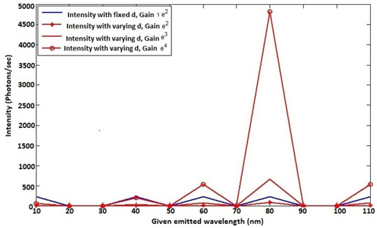 Therefore, reducing the slit-width reduces the bandpass at the expense of the intensity, as shown in Figure 15. In our proposed system, when reducing the slit-width through , one observes, as expected, a reduction in the signal level; however, the system has provisions that mitigate the reduced intensity by amplifying it with the amplifier value, as Figure 15 shows. However, what is important with Figure 15 is that as the wavelength increases, the system intensity increases as well. This comes with the fact that the diffraction angle decreases (not zero) when the wavelength increases, and that only the exact required slit-width or bandpass is presented to the incoming light, not too much bigger than the wavelength, in which case only a dot will appear on the display unit, and not too small because the diffracted light might go beyond the display unit. Consequently, if the adapter, through a proper calibrator , concentrates the signal on the diameter of the etendue, then all the photon flux without loss reaches the etendue, as shown in Figure 15, keeping the clarity of the particle.