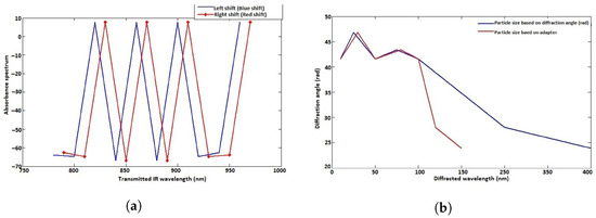 Figure 16 shows the effects of on particle size based on the absorbance and diffraction angle. The system exhibits blue or red shift (Figure 16a) and shows that the diffraction angle increases when the wavelength decreases (Figure 16b) in accordance with the size of particles. We all know that the diffraction angle increases when the slit-width decreases, hence the wavelength decrease observed. Figure 16, in sizing up particles compared to the wavelength, shows that there are red shift and blue shift possibilities with the absorbance spectrum, knowing that a right shift, known as red shift, detects particles of bigger size, or a left shift, known as blue shift, indicates smaller particles (Figure 16a). It is also shown in Figure 16b that the diffraction angle or diffraction pattern is bigger for smaller particles and vice versa.