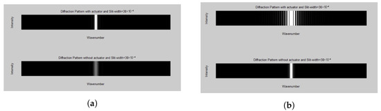 We further conducted MATLAB simulations using the system setup above with the aim of confirming the results of our evaluations. For this purpose, we kept all the assumptions mentioned above, and we chose for the sake of this simulation a fixed display unit distance m, and an initial uniform grating with slit-width m, which is likely to change due to the associated MEMS actuator, in accordance with the function . In the current simulation, we assumed a slit-width reduction due to the actuator displacement and for the sake of simulation. Since we are interested in the IR spectrum, we would like to see how this spectrum behaves on the screen when varying the calibrator positions. Therefore, we assumed a laser source emitting a near-IR of 750 nm wavelength, and a sample emission or transmission within a range of [630–800] nm. To obtain this range, we assume that this wavelength may be absorbed and the molecule energy upconverted to yield VL emission [630–700] nm, or it may simply lose energy leading to a bigger wavelength [750–800] nm. The aim of this variation is to investigate the sensitivity of our system compared to the old one to several spectrum ranges for system integration capability, with the diffracted angle chosen to be for numerical purposes. Since the theory requires that the calibrator moves at least within , we started checking the screen’s behavior from mm, moving the numbers downward up to where an image appears for both our system and the old one. Henceforth, 50 mm was retained, and the other values were chosen in terms of the attainable objectives on the display units; that is, the required accuracy, sharpness, and brightness, without excluding the density of wavenumbers. Therefore, we retained the following calibrator positions mm for the simulations. The display unit presents, for each case, our system and the old system for comparison purposes, or our system against the optimal position. In the end, we discuss the possible detectable size of particles or images. The results of these simulations are given in Figure 17, Figure 18 and Figure 19.