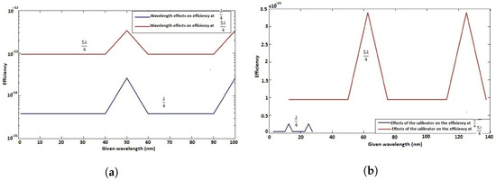 (a) Wavelength effects on efficiency. (b) Calibrator effects on efficiency.