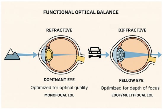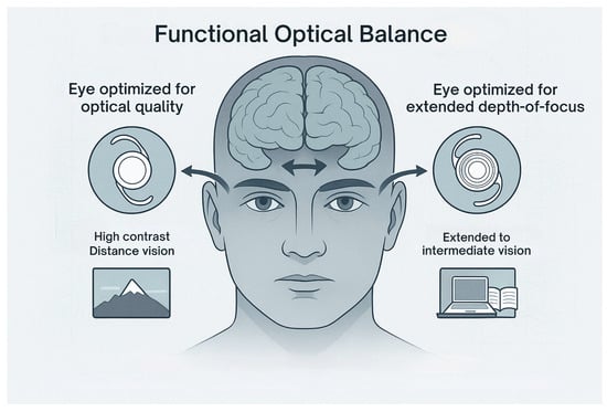Schematic representation of the Functional Optical Balance (FOB) strategy in cataract surgery. One eye is optimized for high optical quality and distance vision using a monofocal or enhanced monofocal intraocular lens (IOL), while the fellow eye is implanted with an IOL that extends the depth of focus (EDOF or multifocal) to improve near and intermediate visual function.