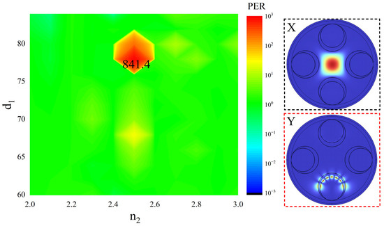After conducting research on the refractive index of the cladding tube in the y-direction, it was obtained that the y-direction polarization mode couples with the surface mode of the cladding tube in the y-direction. Subsequently, through the investigation of the inner diameter d1 of the inner embedded cladding capillary and n2, in order to enhance the coupling between the y-direction polarization mode and the surface mode of the cladding tube and thereby obtain a greater PER, we fixed the core diameter at 85.68 μm. According to the resonance principle of the AR-HCF, the wall thicknesses of the inner and outer capillaries were made the same at 0.72 μm. The wall thickness d1 of the inner embedded capillary was selected within the range of 60–85 μm, the wall thickness d2 of the outer capillary was maintained at 91 μm, and the refractive index n2 of the higher refractive index material was chosen within the range of 2.0–2.5. The influence of the inner diameter of the embedded tube on PER was studied. In other words, what we investigated was the impact of the distance between the inner embedded tube and the outer cladding tube on the calculation results. Because the introduction of the nested anti-resonance tube increased the radial air–glass anti-resonance layer, the inner embedded tube could reduce the weak interference overlap between the core and cladding modes, thereby reducing the confinement loss and bending loss in the core. However, what we expected was an increase in the y-direction leakage loss and a decrease in the x-direction leakage loss. A suitable inner diameter of the embedded tube was required to achieve this effect. The calculation results are presented in Figure 3.