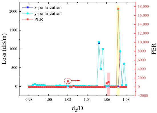 From Figure 4, it can be observed that when d2/D = 1.072 (within the yellow shaded region), the loss in the y-polarization fundamental mode exceeds 2000 dB/m, while the loss in the x-polarization fundamental mode is 0.117 dB/m. A portion of the x-polarization fundamental mode undergoes micro-coupling with the cladding mode, resulting in a relatively large leakage loss in the x-polarization fundamental mode. At this point, the polarization extinction ratio is greater than 17,524. Although the PER value is favorable at this moment, the low-loss transmission of the x-polarization fundamental mode still needs to be considered. When d2/D = 1.062 (within the red shaded region), the loss in the y-polarization fundamental mode is 11.264 dB/m, but the loss in the x-polarization fundamental mode is merely 0.00987 dB/m. Under these conditions, only the x-polarization fundamental mode can be stably transmitted within the fiber core, and the polarization extinction ratio is 1141.52, indicating the realization of the single-mode transmission of the x-polarization fundamental mode of the fiber. The loss in the y-polarization fundamental mode undergoes significant fluctuations with the alteration of d2 and maintains a relatively high loss value. Hence, in this section, the optimal parameter for the capillary radius d2/D is selected as 1.062.