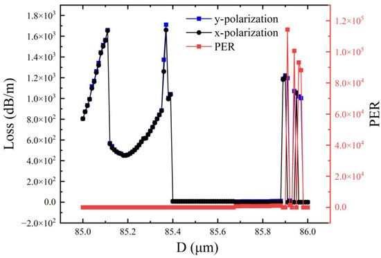 Figure 5 depicts the variation relationship between the x-polarized fundamental mode loss, PER, and the core diameter D at a wavelength of 2.79 µm. It can be conspicuously observed that when the core diameter is 85.71 µm, the loss in the x-polarized fundamental mode is minimized, with a loss of 0.00932 dB/m and a PER value of 872. When the core diameter is 85.94 µm, the x-polarized loss is 0.01065 dB/m, and the PER is greater than 1.01 × 105 at this point. Since the actual application scenario, we ultimately have only required transmission over a few meters; therefore, the loss of 0.01065 dB/m over short distances is adequate to meet the usage requirements. Therefore, we ultimately select D = 85.94 µm as the optimized structural parameter.