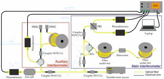 In this experiment, the continuous and highly coherent radiation from a tunable laser source (Santec TSL-570-P-480640-P-F-AP-00-1 with 50 kHz linewidth, Santec, Fukuoka, Japan) was split into three independent paths. One of these paths was the main interferometer, consisting of a three-port fiber circulator and optical power couplers (all passive optical components in this setup were manufactured by AFR, Zhuhai, China). The other two paths were reference channels, each containing different components: one included two Faraday mirror assemblies (AFW FOFM-15-L-1-2, AFW Technologies, Ltd., Hallam, Victoria, Australia), with a delay line in one arm (single-mode SMF28 fiber, Corning Inc., Corning, NY, USA), while the other contained a wavelength reference (acetylene gas cell, 50 mTorr, HCN, Wavelength References, Corvallis, OR, USA) as a wavelength monitor. All radiation from these paths was detected using Femto photodetectors (HCA-S-200M, FEMTO Messtechnik GmbH, Berlin, Germany). The radiation was split again into two paths before reaching the photodiodes in the main interferometer using a polarization splitter, allowing for the monitoring of polarization changes along the line. An SMF28 optical fiber with two reflection events was also used as the test line. In order to observe significant optical losses in the trace, an optical power attenuator was incorporated into the line. The maximum possible sweeping range of the laser source was 150 nm. Variation in this parameter allows for the flexible control of not only the measurement time but also the spatial resolution. In these experiments, we used a tuning range of 40 nm. This allowed us to obtain a spatial resolution of about 20 μm. The attenuator was selected such that the signal reduction in the raw trace would be 2 dB. This value was monitored by measuring the accumulation of the signal along the length of the trace over 3500 data points. The system was calibrated using a variable attenuator and an OBR4600 reference reflector by Luna Inc., Roanoke, VA, USA.