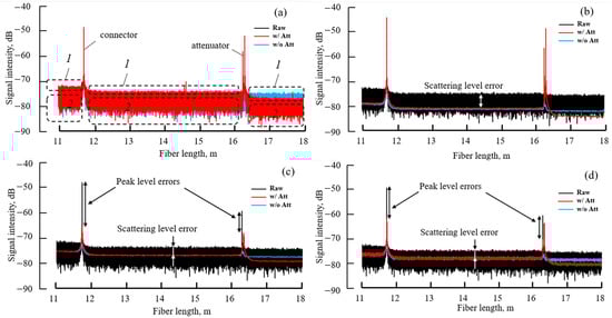 From Figure 2a–d, which also show the original trace without an attenuator in black for clarity, it can be observed that frequency filtering and empirical mode decomposition, followed by the reverse composition of modes back into the original, reduced the noise component of the backscatter in some way. However, at the same time, they significantly reduced the intensity of retro-reflection peaks.