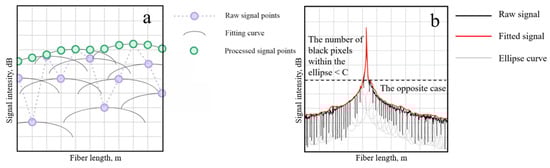 Any optical reflectometer or distributed fiber optic sensor faces the task of recording ultra-weak backscattering [11,12,13]. The noise of photodetectors, sometimes comparable in intensity to the useful signal, begins to play a decisive role when it is necessary to record backscattered signals from sections of the optical fiber remote from the laser [14,15,16]. It is especially important to maintain the correct signal-to-noise ratio in the case of recording an even weaker signal than that in Rayleigh scattering—as seen in spontaneous or stimulated Brillouin scattering [14,17,18], in particular, if optical fibers with high losses are studied [19]. Since the backscattered signal in this case has the spectral form of a Lorentzian function, the corresponding approximating methods are used to obtain the correct frequency shift [20,21]. The Rayleigh scattering spectra are determined by spatial patterns determined by conglomerates of silica and germanium oxides molecules in the fiber core and cannot be approximated by any known functions in the frequency domain, so the main work with data in systems of this type is performed in the spatial domain. Thus, a moving average and a moving differential, which provide integration and differentiation, respectively, in a window sliding in space can be successfully applied [22,23,24]. These approaches can increase the signal-to-noise ratio but distort the events on the trace. Given these facts, the challenge of creating an approximation method that works in the spatial domain and does not distort the signal is especially attractive.