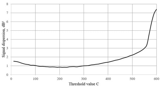 From Figure 6, it is clear that the dispersion of the processed signal decreases with C until the point when the threshold value becomes too high, and thus there are fewer points for which the condition is fulfilled. Eventually, the algorithm stops working altogether, which leads to a sharp rise in dispersion.