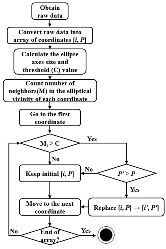 Next, there is no need to modify the signal in any way within the area of Fresnel reflection. We propose using a criterion based on the k-nearest neighbor principle for this purpose: if there are a large number of original graph points (greater than a certain threshold value C) in the vicinity of a given point, we will consider that point to be part of a “stochastic” region free from Fresnel reflections and thus construct an elliptical arc for that point, whereas if there are fewer neighbors in the point vicinity, we will not construct an arc.