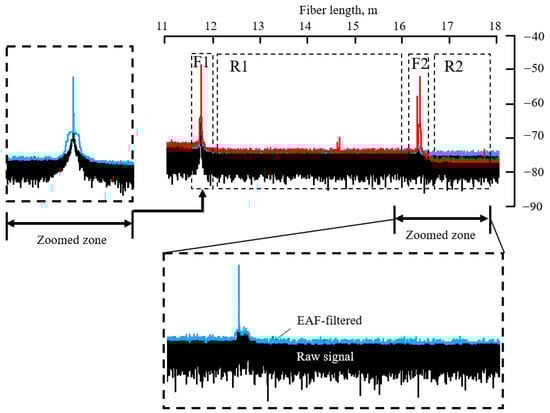 Figure 8 shows the traces processed using the proposed method. Zone F1 depicts the part of the trace that contains the first reflecting event, zone R1 represents a monotonous but noisy section of the trace, and zone F2 represents a section containing a connector or attenuator. Zone R2 contains information on Rayleigh scattering after the connector or attenuator. The two parts of the trace are illustrated in a separate, enlarged drawing for ease of understanding.