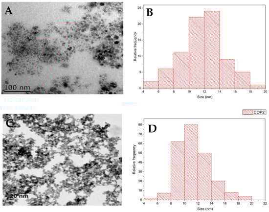 TEM images and size distribution histograms of magnetic nanoparticles. (A,B) correspond to MNP-Q, showing spherical morphology with some degree of agglomeration and a relatively uniform size distribution. (C,D) Correspond to MNP, also showing spherical nanoparticles with slightly different dispersion patterns. Scale bars: (A) 100 nm, (C) 20 nm.