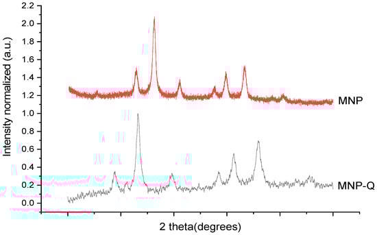 XRD patterns of MNP-Q and MNP samples. The diffraction peaks correspond to the typical spinel structure of magnetite (Fe3O4), indicating the crystalline nature of both samples. Slight differences in peak intensity and width may reflect variations in crystallite size or surface modifications.