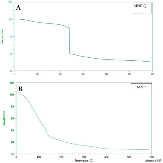 Thermogravimetric analysis (TGA) of magnetic nanoparticles. (A) MNP-Q: magnetite nanoparticles coated with chitosan, showing two distinct weight loss events associated with the degradation of the chitosan layer and moisture loss. (B) MNP: uncoated magnetite nanoparticles, exhibiting a gradual weight loss primarily due to surface-adsorbed water and minor organic residues. Weight loss is plotted as a function of temperature (°C).