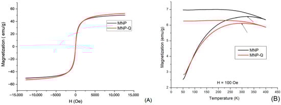 As is displayed in Figure 5A, the magnetic saturation for the MNP-Q sample is 53 emu/g and 51 emu/g for the pure MNP. The magnetic coercivity is 13 Oe for MNP-Q and 12 Oe for MNP, respectively, and the corresponding blocking temperatures depicted in Figure 5B are 320 and 299 K.