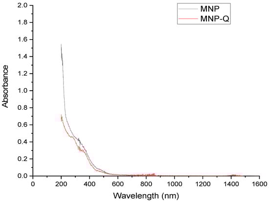 The optical properties of the magnetite nanoparticles (MNP) and chitosan-coated magnetite nanoparticles (MNP-Q) were characterized using a PerkinElmer Lambda 900 UV-Vis-NIR spectrophotometer (Waltham, MA, USA). Absorbance spectra were collected in the spectral range of 200–1600 nm with a resolution of 1 nm, at room temperature. Before measurement, aqueous suspensions of both samples were prepared and placed in 1 cm path length quartz cuvettes to ensure consistency and minimize scattering effects.