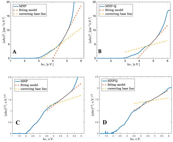 Tauc plots for band gap estimation of magnetic nanoparticles. (A) MNP and (B) MNP-Q samples, these plots show (αhν)2 versus photon energy (hν) used to estimate the optical direct band gap energy (Eg). (C) MNP and (D) MNP-Q samples, these plots show (αhν)1/2 versus photon energy (hν) used to estimate the optical indirect band gap energy (Eg). The linear portion of the curve (dashed red line) is extrapolated to intersect the x-axis, indicating the band gap energy of each sample. A shift in (Eg) is observed for MNP-Q, suggesting that the chitosan coating affects the electronic structure of the nanoparticles.