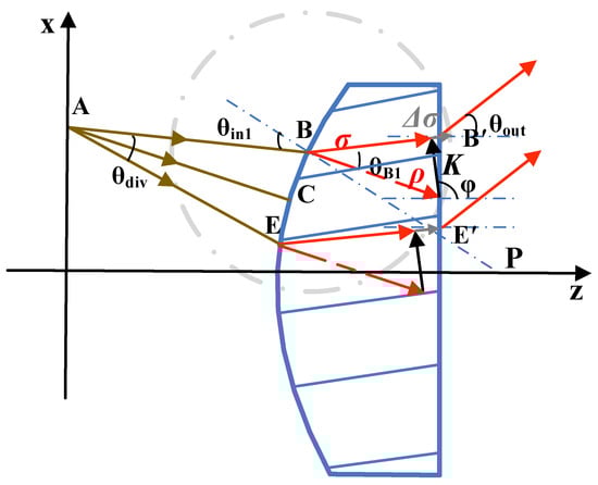 where and denote the output angles after VBG diffraction for the shortest diffractable wavelength and longest diffractable wavelength at the beam margin, respectively (the exit angles of B′ and E′ in Figure 1). The derivation process above innovatively analyzes the diffraction relationships of light waves in the meridional planar of a convex VBG based on coupled-wave theory.