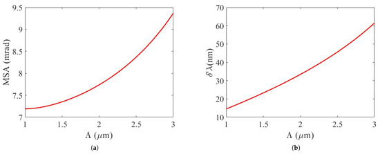 Impact of period on MSA and filtering spectral bandwidth at a central wavelength of 550 nm. (a) The relationships between and MSA. (b) The relationships between and wavelength selective width.