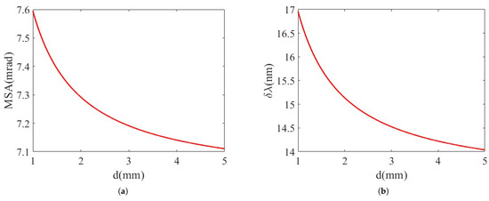 Similarly, according to Equation (5), the influence of thickness variations ultimately manifests in the filtering spectral bandwidth obtained after wavelength shift, thereby affecting the degree of dispersion of the spot on the image planar. The influence of VBG thickness on MSA is shown in Figure 5a; thicker VBG exhibits narrower spectral width, according to Equation (5). An increase in thickness reduces the intrinsic wavelength-selective width of the VBG, as illustrated in Figure 5b, ultimately leading to a reduction in MSA.