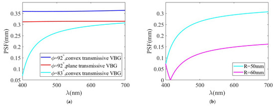 During diffraction-limited imaging with a fixed focal length f of the imaging lens, the Point Spread Function (PSF) was established to evaluate the imaging spatial resolution of the convex transmissive VBG.