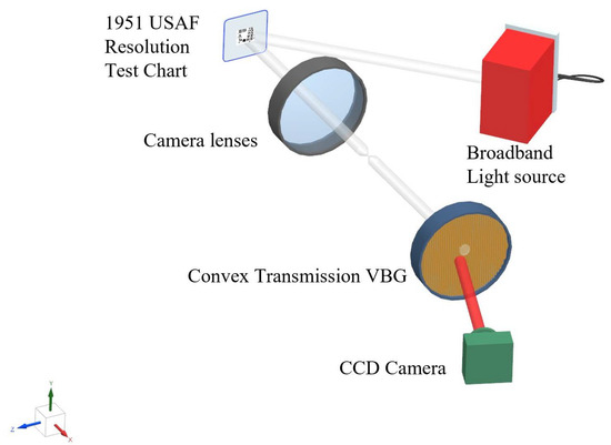 Planar transmissive VBG based spectral imaging system. Converging lens: , ; CCD: .
