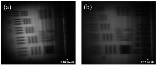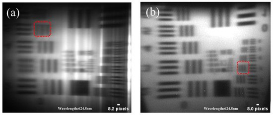The USAF-1951 resolution target used in Figure 7 and Figure 8 is widely employed to evaluate the resolution capability of optical imaging systems (such as microscopes and cameras). Figure 9 presents the imaging results for both planar and convex transmissive VBG. Due to aberrations in the imaging system, the image quality at the edges is inferior to that at the center. The image of the resolution target obtained with the planar transmissive VBG (the red dashed box in Figure 9a) allows identification up to group (0), element (5), corresponding to a measured line pair density of 1.59 lps/mm. However, the imaging quality is significantly degraded across the wavelength tuning range due to pronounced stray interference fringes. In contrast, the image acquired with the convex transmissive VBG (the red dashed box in Figure 9b) resolves features up to group (1), element (3), corresponding to a measured line pair density of 2.52 lps/mm. This represents a mere 9% deviation from the theoretical value of 2.77 lps/mm.