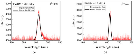 At the central wavelength indicated in Figure 9, spectral measurements were performed on the image planar of the spectral imaging system. In Figure 11, the red curve represents the measured data, while the black curve denotes the fitted result. Experimental data reveal that the spectral tuning range of the planar VBG is approximately 598–663 nm, while that of the convex VBG is approximately 600–630 nm. The planar transmissive VBG exhibits a filter FWHM of 28.42 nm (Figure 11a). In contrast, the convex transmissive VBG achieves a significantly narrower FWHM of 17.37 nm (Figure 11b), representing a 63.6% reduction in spectral bandwidth. Furthermore, the spectral distribution of the convex VBG more closely approximates a Gaussian profile. (The fitting was performed over the 550–700 nm range, resulting in an increase in R2 from 0.90 to 0.93.) This observation further validates the performance advantage of the convex VBG structure in spectral selectivity.