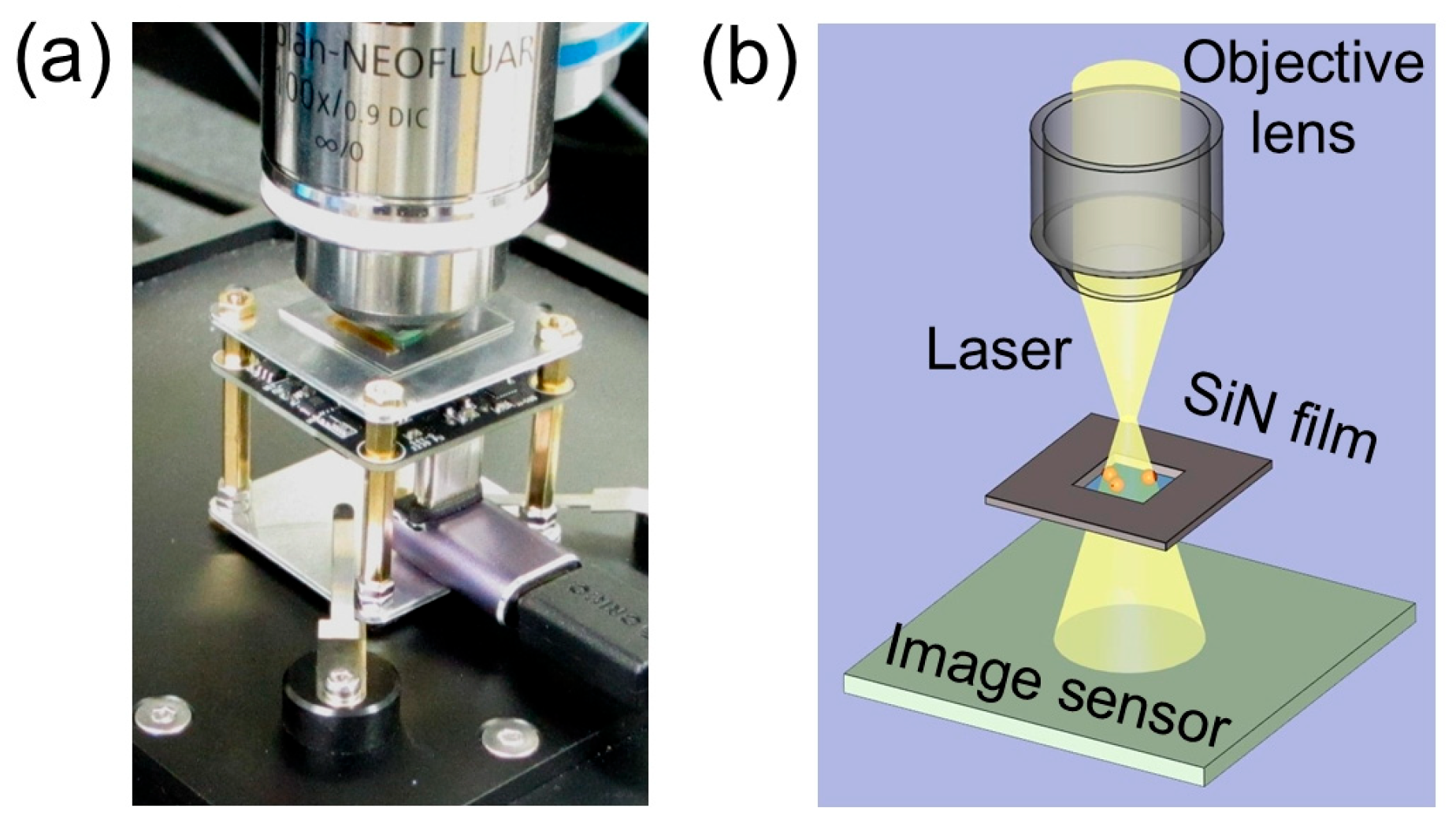 The samples on a silicon nitride (SiN) film (Silson Ltd., Southam, UK) were observed by a confocal laser Raman microscope (CLRM) (alpha300R, WITech, Ulm, Germany) using a 100× objective lens (Plan apo, Carl Zeiss, Oberkochen, Germany) and a 532 nm Nd-YAG laser. The CMOS image sensor (DFM37UX273-ML, The Imaging Source Co., Ltd., Bremen, Germany) was placed 5 mm below the focus position of the objective lens (