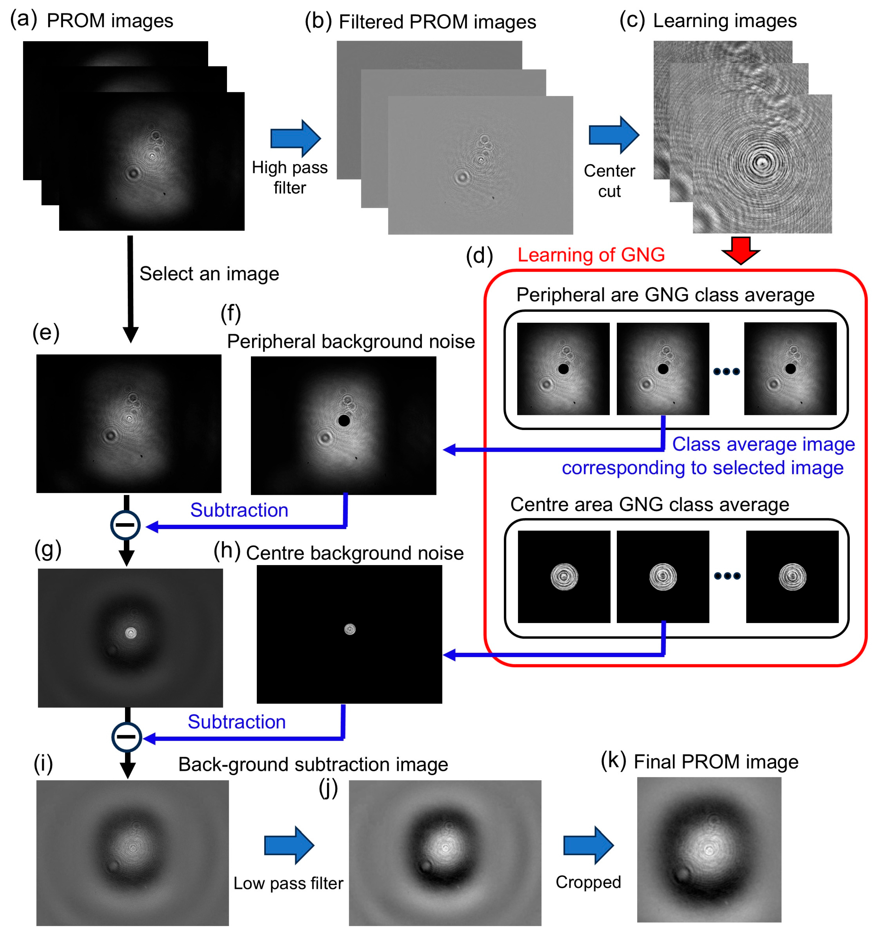 19], we used an image obtained by extracting the high-frequency components of the PROM images and cutting out the central area of 400 × 400 pixels. The number of learning images for each sample was 14,350 for the PS spheres and the ZnO sample, 14,400 for the sunscreen sample, and 6000 for the milk sample. The number of GNG units was 100 units inside the PS sphere image and 50 units outside for the sphere samples, 20 units for the ZnO particles, 20 units for the sunscreen sample, and 10 units for the milk sample. The number of learning sessions was set to 200,000 iterations.