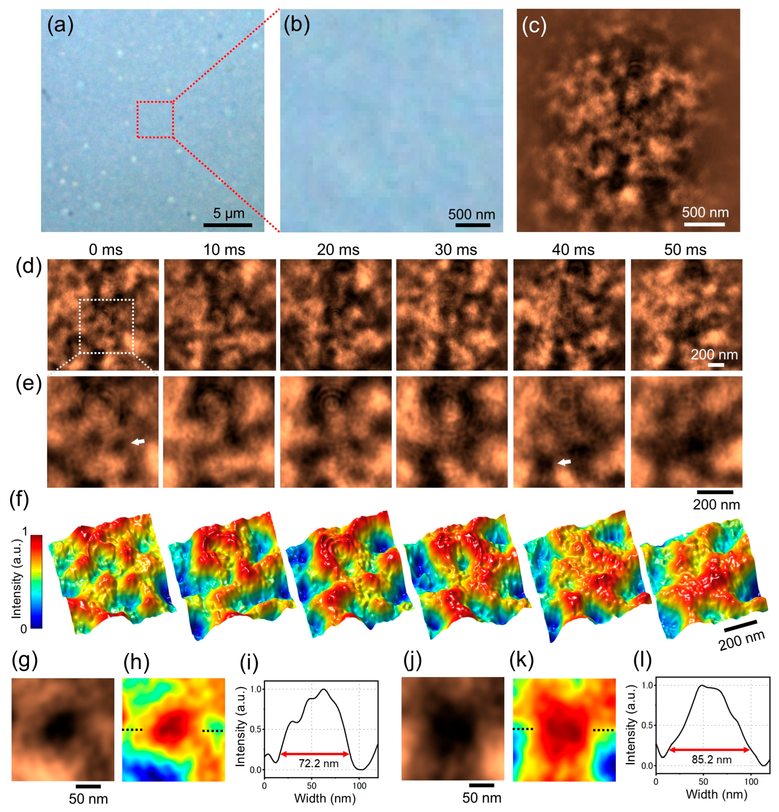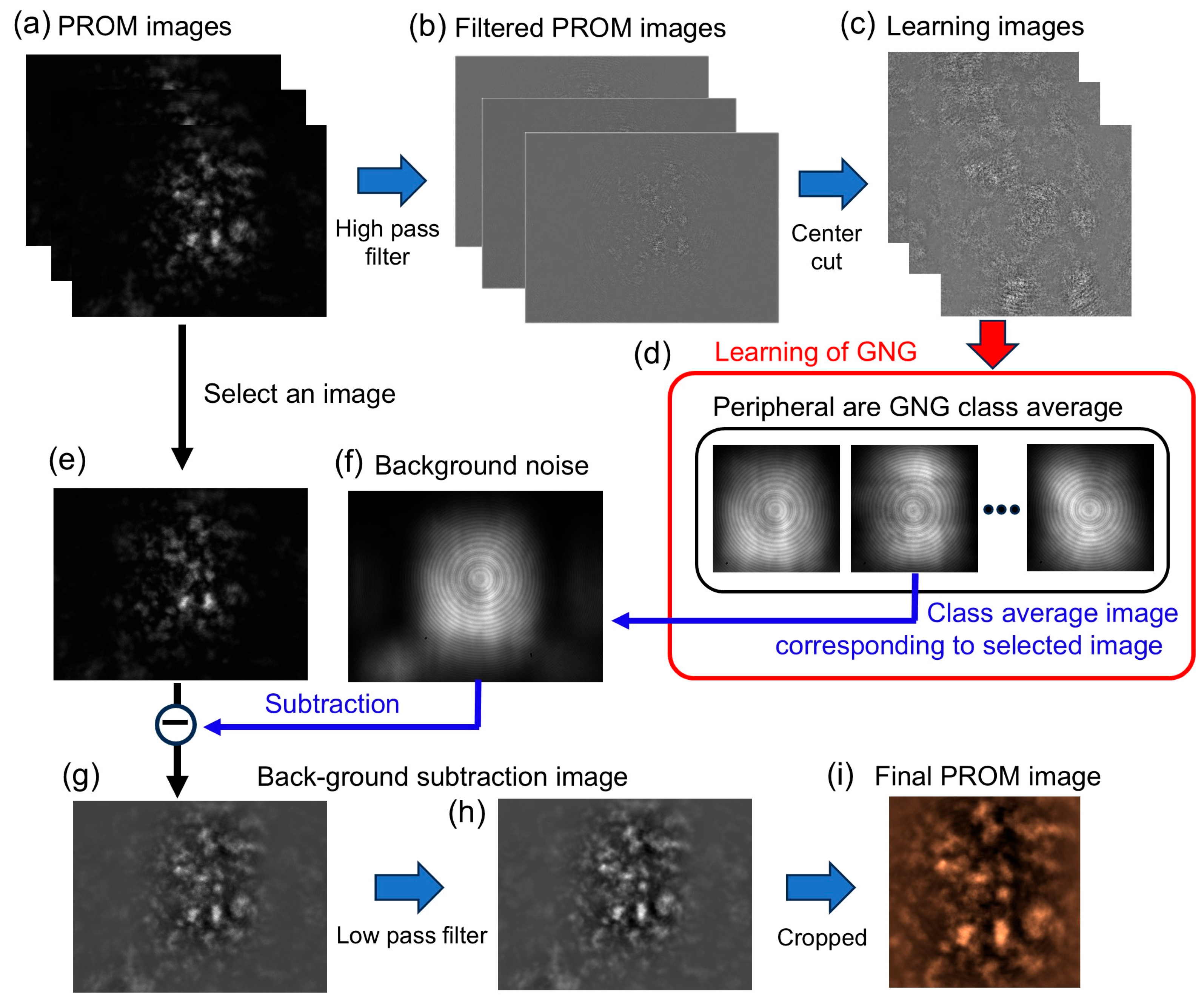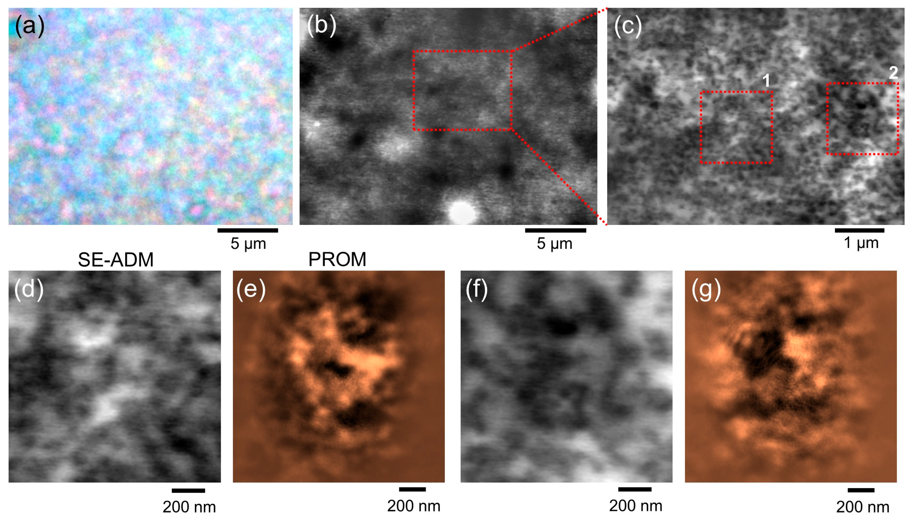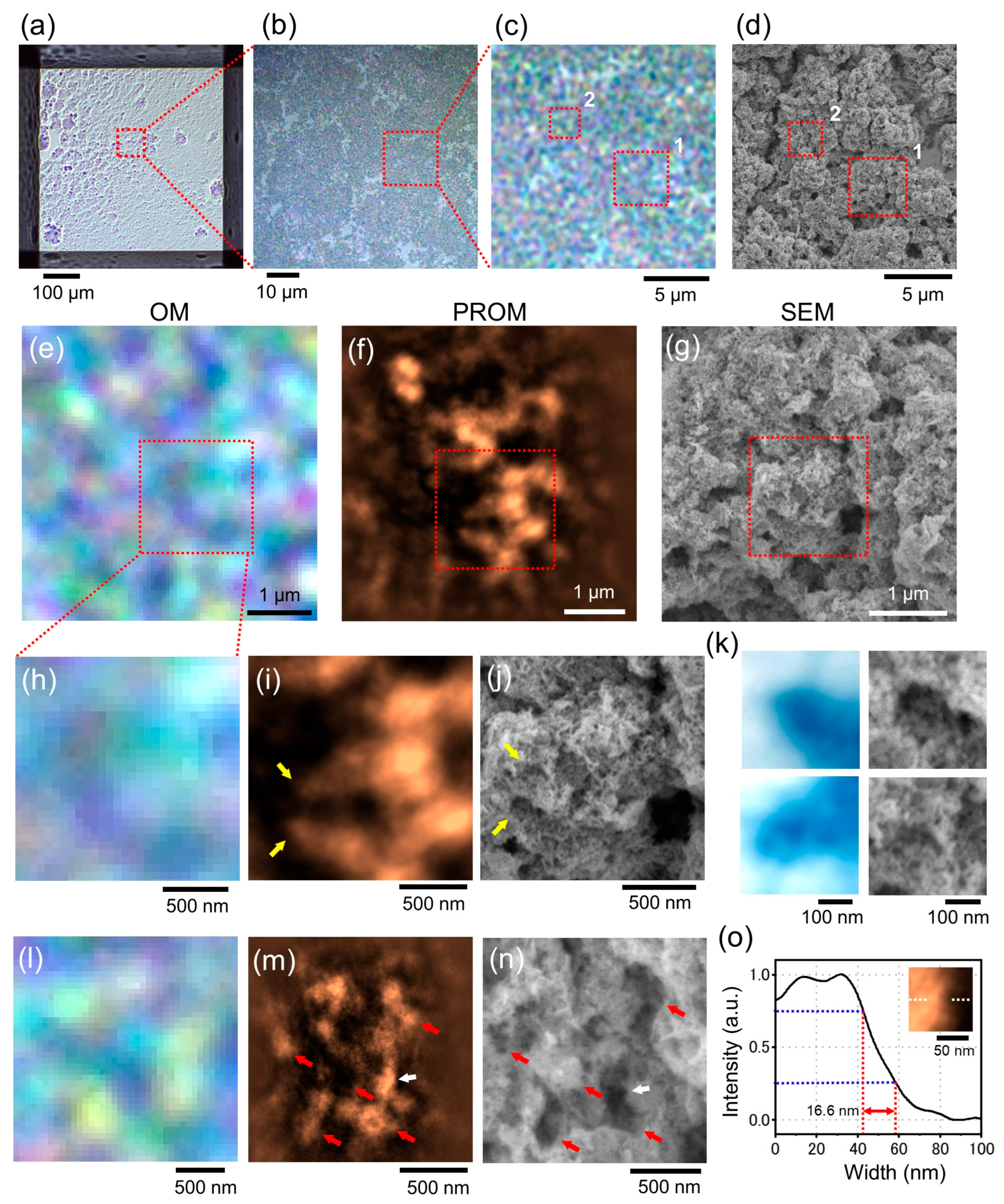 Figure 5o). The wavelength of the laser beam used was 532 nm and the spatial resolution due to Abbe diffraction using a 100× objective lens (NA 0.9) was approximately 300 nm. Therefore, PROM observation achieves a much higher spatial resolution than the diffraction limit. Furthermore, the spatial resolution and contrast can be improved by using shorter wavelengths. We predict that a resolution of less than 10 nm could be achieved by using a 400 nm laser beam.