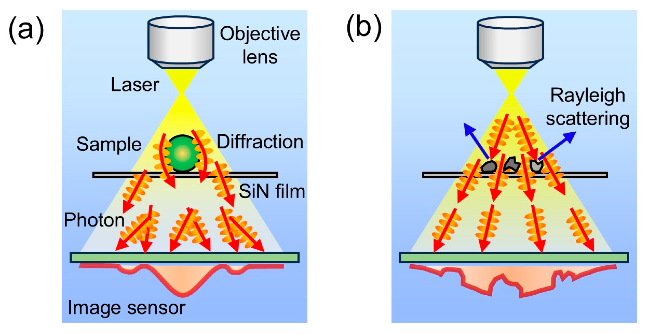 Figure 8a). On the other hand, nanoparticles and nanostructures do not cause light diffraction but only Rayleigh scattering. Therefore, the incident light at the particle position is scattered, while that between the particles is transmitted, and the image sensor captures a projection image of the nanoparticle (