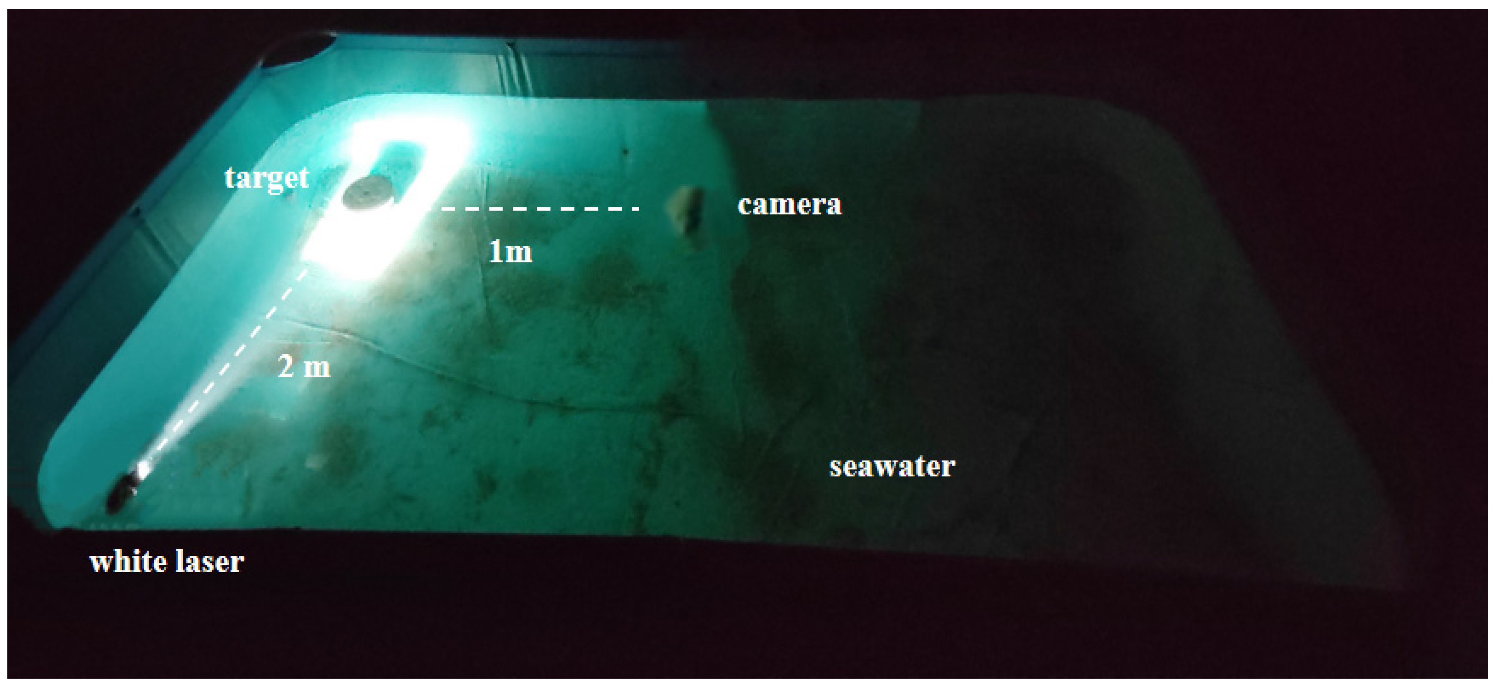 Figure 2 depicts the short-range underwater white laser imaging experiment. The white laser parameters are presented in