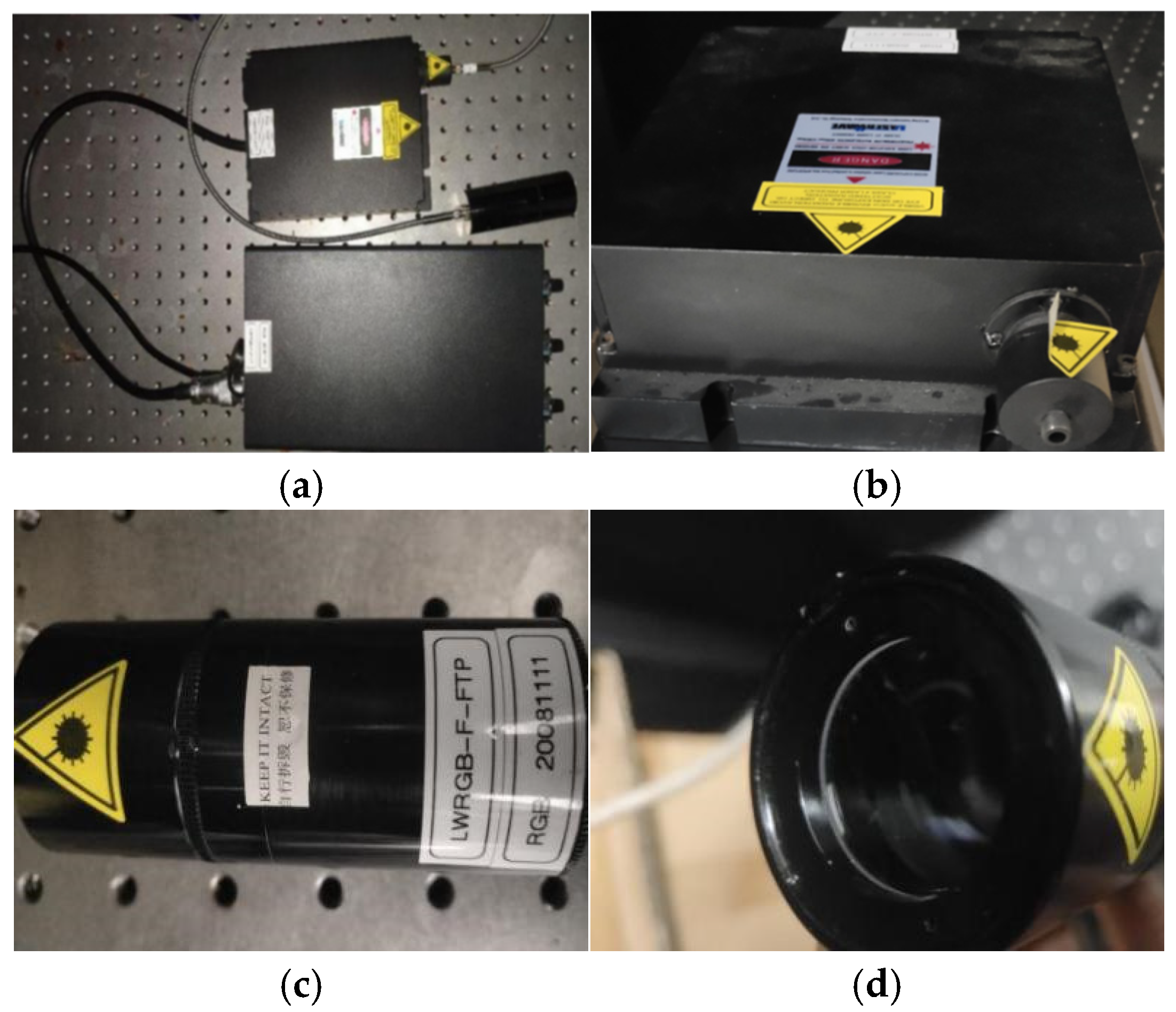 The RGB white laser used in the lab is the LWRGB-F-FTP laser (LaserWave, Beijing, China). It has stable power, high beam quality, and easy operation. The white laser structure includes a power supply, laser head, optical fiber, and mirror barrel. As shown in