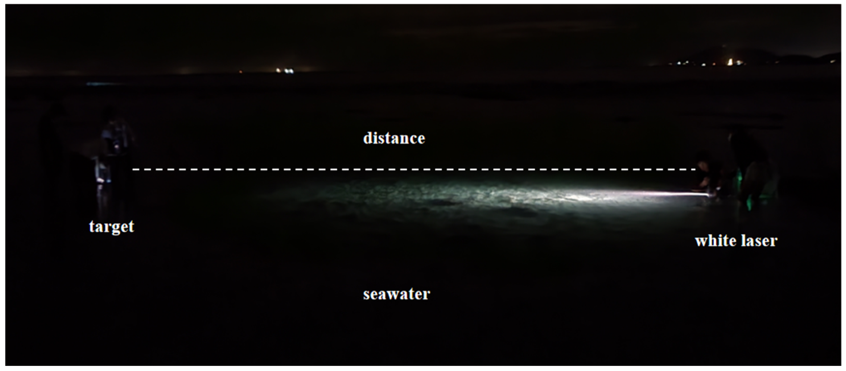 Figure 4 shows the long-range underwater white laser imaging experiment. In this experiment, the long-range tests were conducted under an illuminance level below 1 lx. The illumination was provided by a white laser synthesized by combining three primary colors: red (638 nm), green (520 nm), and blue (445 nm). The parameters of the white laser are summarized in