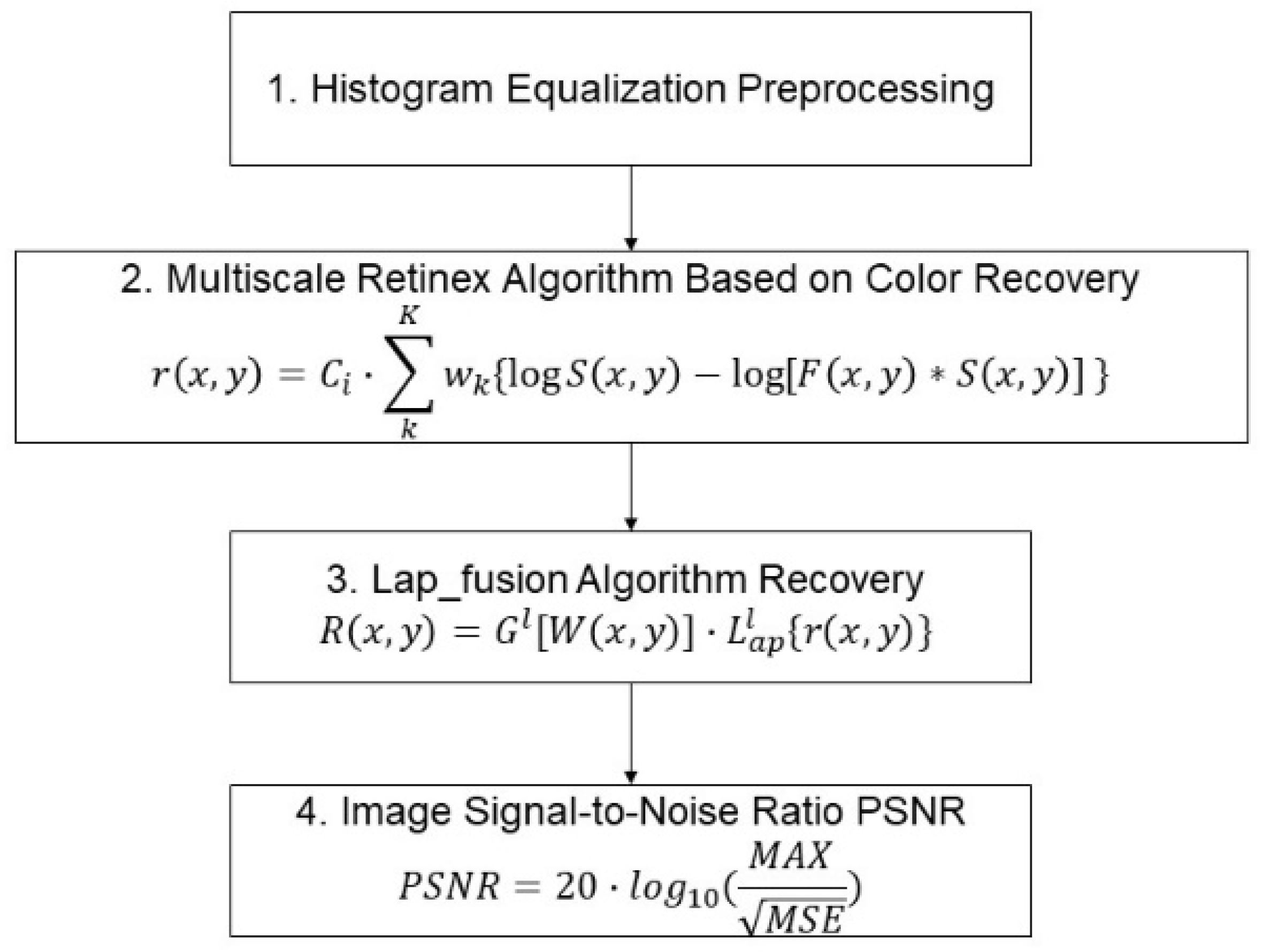 16]. The image is first pre-processed with histogram equalization to enhance the basic features of the image, reduce the background noise, and improve the processability of the image. Then, the image is optimized using the Retinex algorithm based on color recovery to enhance the color of the underwater image, achieve the edge point sharpening effect of the target, and incorporate the multi-scale processing and color recovery mechanism based on ensuring the image is not distorted and color constancy. The Retinex algorithm assumes that the illumination is homogeneous, resulting in a significant difference in brightness of the image region in the presence of exposure. In order to compensate for the loss of detail caused by exposure, the subsequent image is restored using the Lap_fusion algorithm, which restores the information about the underwater target to a greater extent and optimizes the underwater image. The image processing flow is shown in