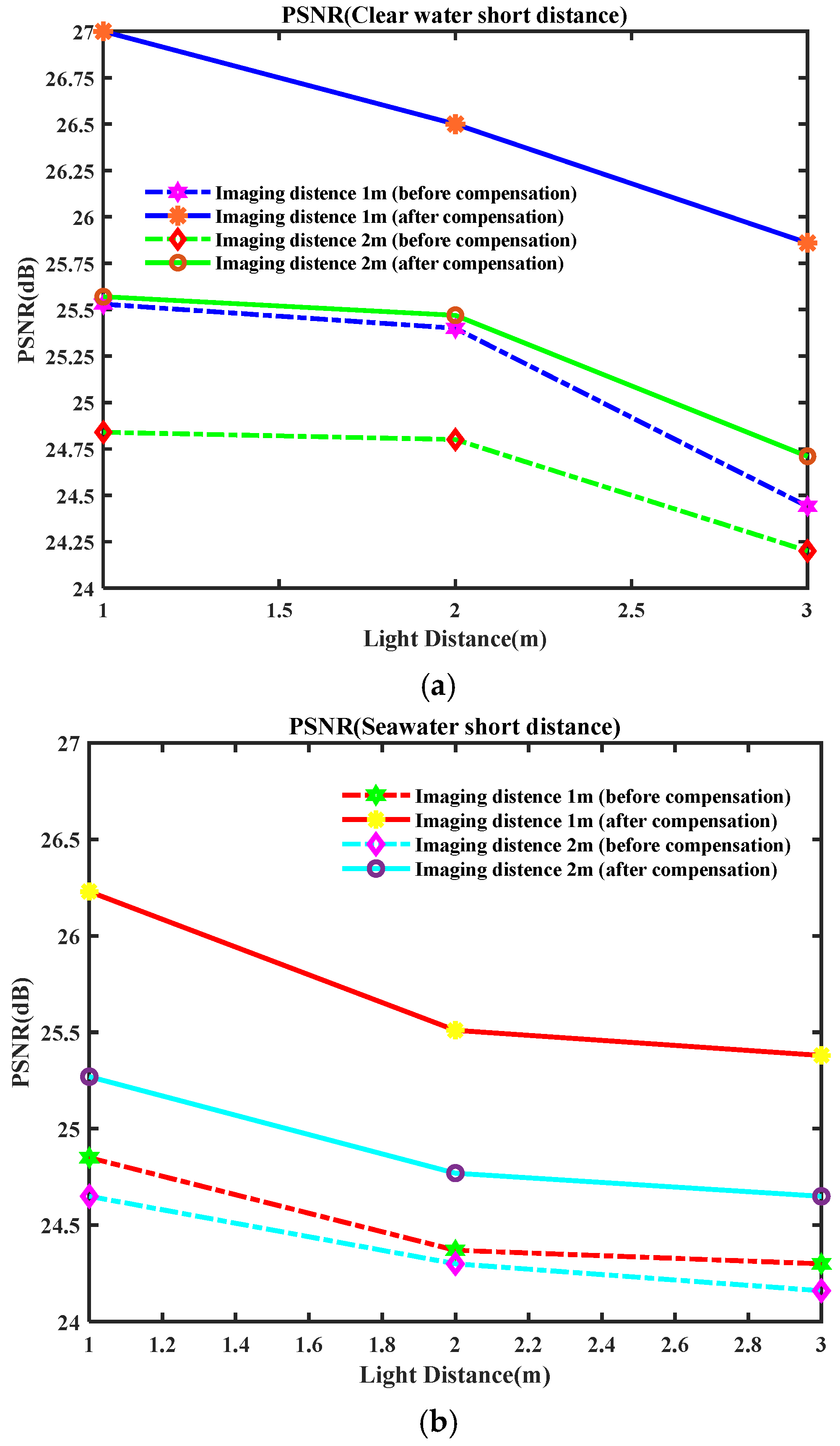 Figure 7a shows the PSNR variation curves for the D65 white laser and the power-compensated white laser under clear water conditions, with a light source distance of 1–3 m and an imaging distance of 1–2 m, while