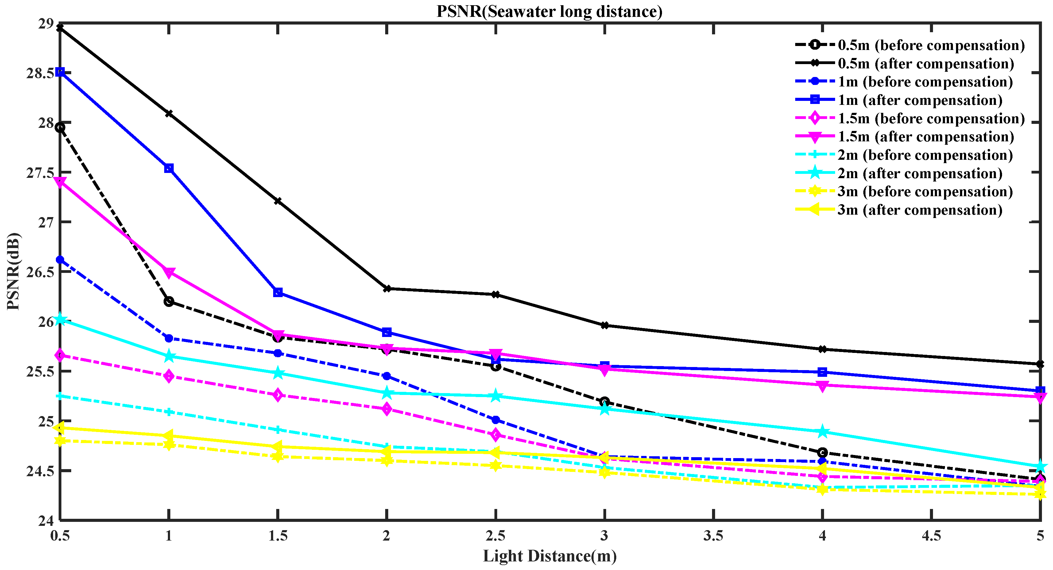 Table 14 shows that as the light source distance increases from 0.5 m to 5 m, the PSNR of the images in this imaging distance stage decreases compared to the previous stage. Similarly, as the imaging distance increases from 0.5 m to 3 m, the PSNR of the images in each light source distance stage also decreases compared to the previous value. Finally, when the transmission distance is increased to the maximum, the PSNR of the images before and after the compensation of the light source reduces by 3 and 2.78, respectively. The results indicate that the PSNR of the images decreases with increasing transmission distance, and the decreased value decreases layer by layer, which is more in line with the exponential attenuation nature. Additionally, after the water body attenuation, the artificial light source illumination weakens at longer distances, resulting in little contrast between before and after compensation and similar PSNR values. As a result, there is little variability in the reduction values of the images.