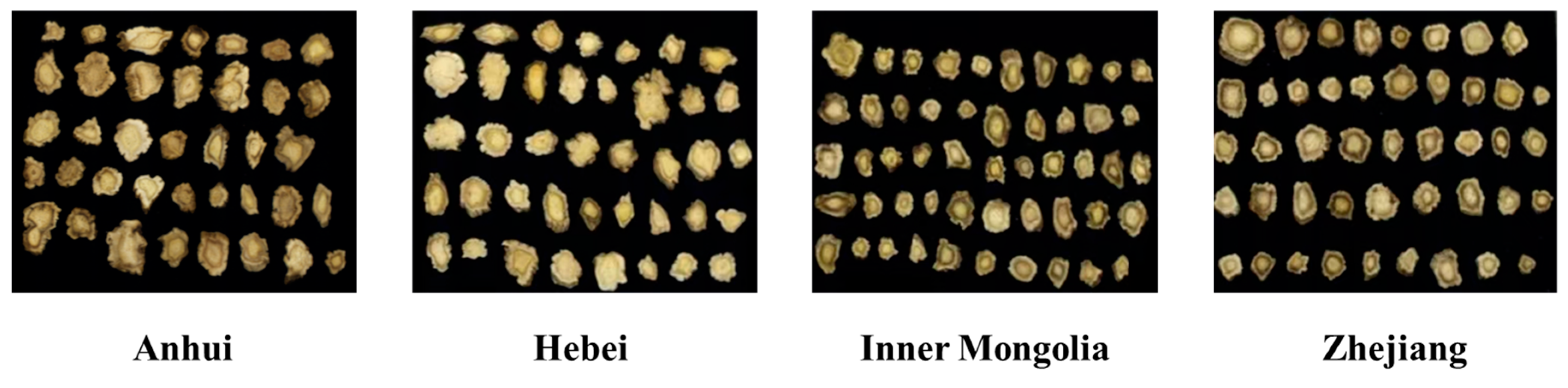- Zhang, L.; Guan, Y.; Wang, N.; Ge, F.; Zhang, Y.; Zhao, Y. Identification of growth years for Puerariae Thomsonii radix based on hyperspectral imaging technology and deep learning algorithm. Sci. Rep. 2023, 13, 14286. [Google Scholar] [CrossRef]