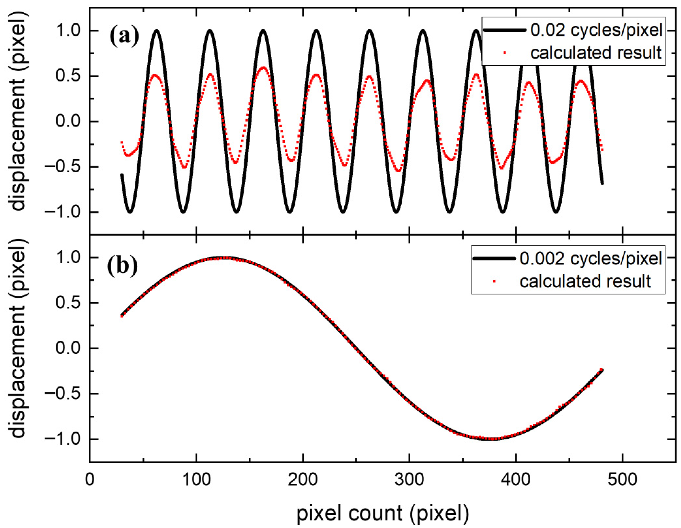 Figure 2b, maintaining identical displacement amplitude but extending the period to 500 pixels (frequency = 0.002 cycle/pixel), the measured results (red dots) closely match actual displacements (black curve), achieving a RMSE of 0.01. Thus, different spatial frequencies impose distinct demands on the spatial resolution of subpixel registration algorithms.