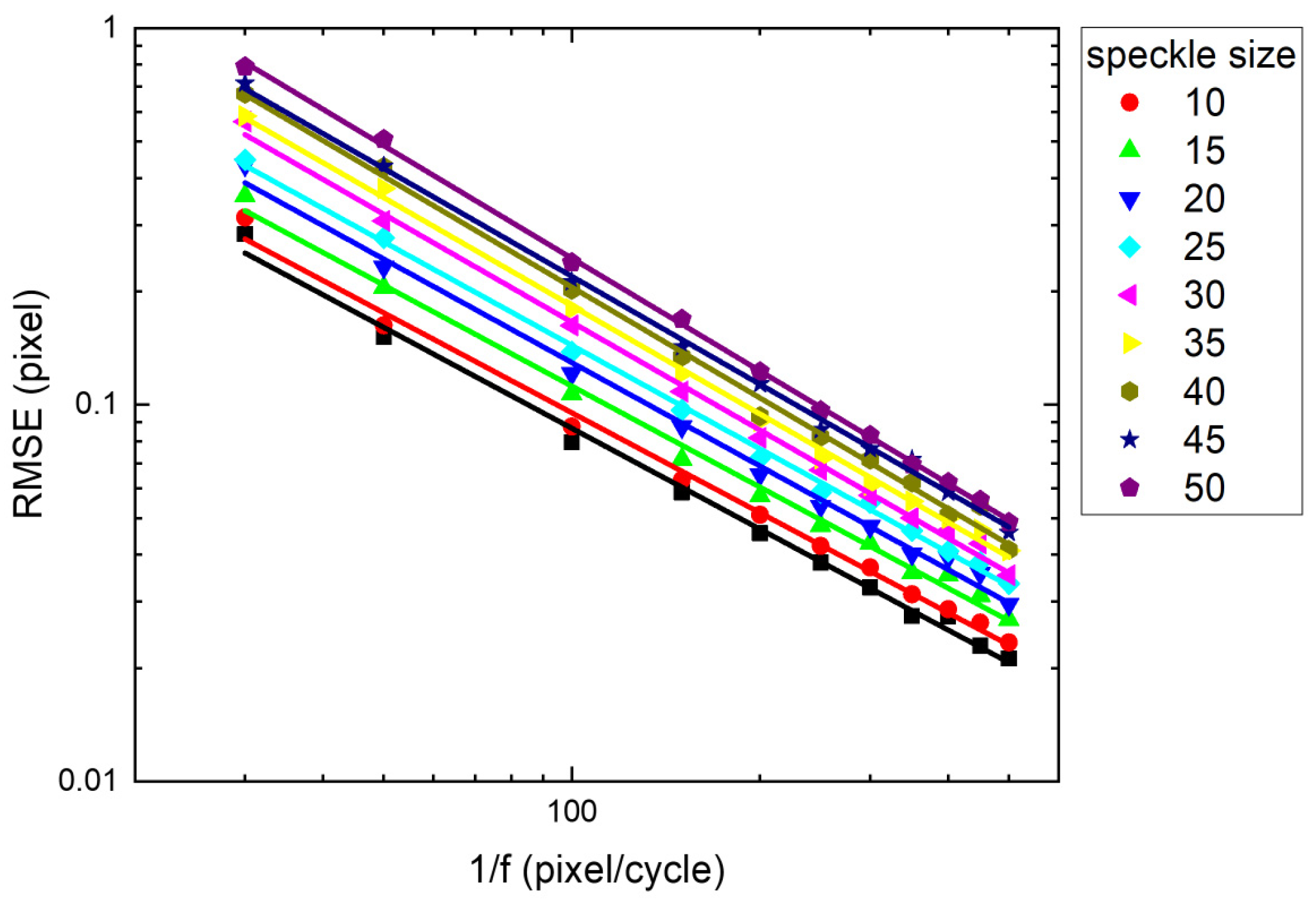 Figure 8 shows the optimal RMSE for all speckle sizes and spatial frequencies, which are plotted on logarithmic axes. The optimal RMSE grow exponentially (detailed fitting parameters are available in
