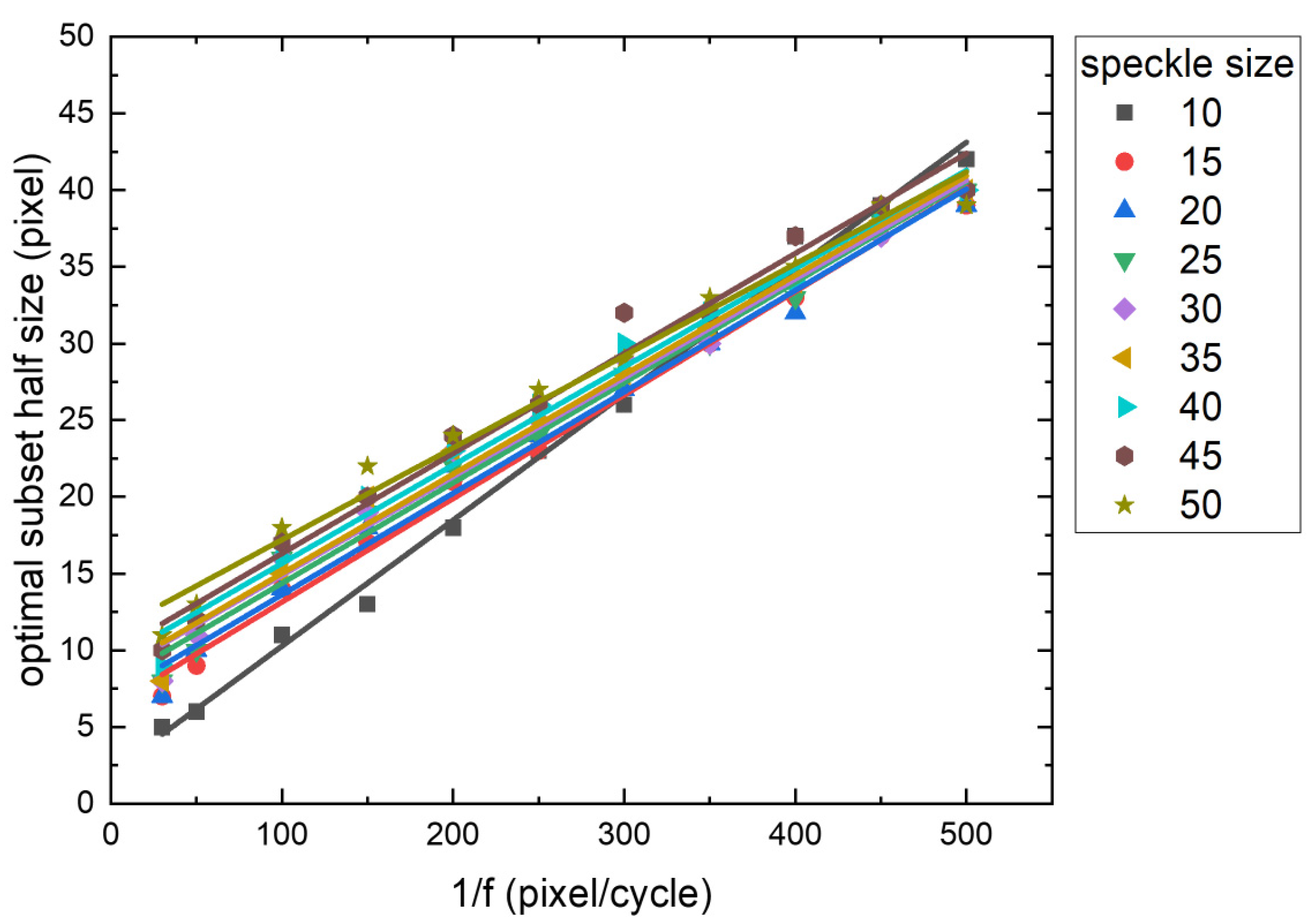In addition to the spatial frequency, the speckle size and subset size influence the results. These factors are addressed differently in this method.