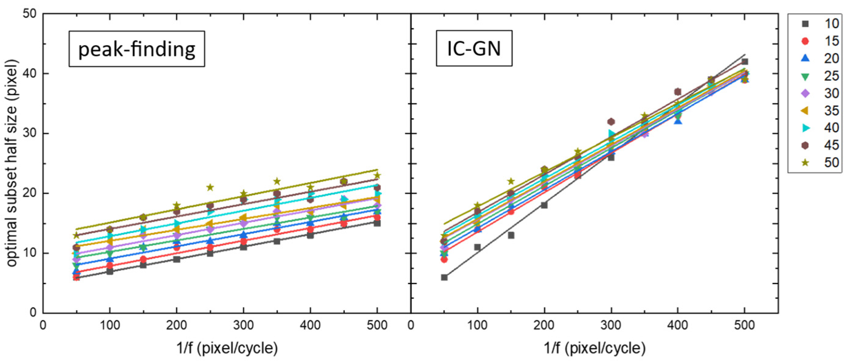 Table 1 show the peak-finding algorithm’s average slope is 0.02141 versus 0.06520 for the IC-GN algorithm—approximately three times steeper. This indicates that at low frequencies, the IC-GN algorithm requires substantially more data than the peak-finding algorithm to achieve target performance. At high frequencies (approximately 0.01), spatial resolution becomes the dominant constraint, forcing both algorithms toward similar subset size levels. In most cases, the IC-GN algorithm requires larger optimal subset sizes than the peak-finding algorithm, partially explaining the latter’s faster computational speed.