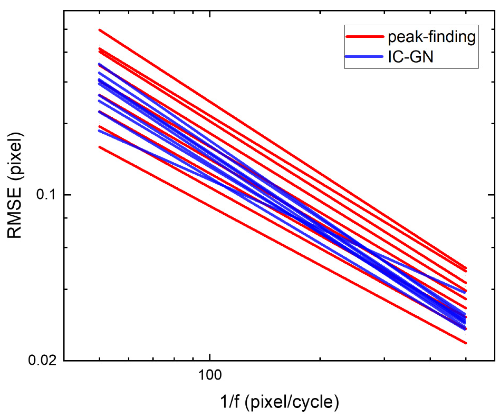 f as the horizontal axis and RMSE as the vertical axis, where higher RMSE values indicate poorer accuracy. The red and blue lines represent fitting results for the peak-finding algorithm and IC-GN, respectively, with detailed parameters provided in