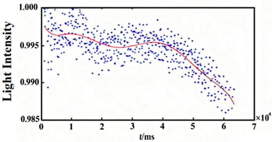 In the actual measurement process, the response characteristics of photosensitive elements usually exhibit non-linearity [14,15], which can lead to errors in measurement data. To solve this problem, we carry out non-linear correction work. By comprehensively testing the characteristics of photosensitive elements, the response data of photosensitive elements under different illumination intensities are obtained, and corresponding non-linear models are established. Common non-linear models include polynomial models, exponential models, etc. Based on the established models, curve fitting algorithms are used to correct the measurement data, converting the non-linear response into a linear relationship and effectively improving the accuracy and reliability of the measurement data. For example, a polynomial fitting algorithm is used to fit the response curve of the photosensitive element to obtain the fitting polynomial coefficients [16,17], and then these coefficients are used to correct the actual measurement data, thereby eliminating the influence of non-linear factors on the measurement results. The fitting effect is shown in Figure 1