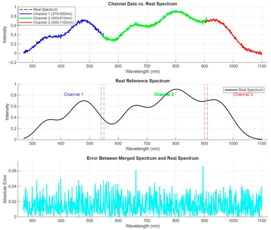 The simulation results of multi-channel spectral sampling (as shown in Figure 4) indicated that the spectral ranges assigned to each channel were effectively utilized. The spectral data collected from all channels, when combined, provided a comprehensive view of the incident light spectrum. The independent optical channels ensured minimal crosstalk between different spectral regions, enhancing the accuracy of spectral information acquisition.