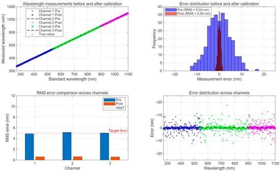 The simulation results (as shown in Figure 5) indicated that the least-squares-based multi-channel calibration significantly improved the accuracy of wavelength measurement. The root-mean-square (RMS) error between the measured wavelengths and the actual wavelengths of the standard samples was reduced from an initial value of 5 nm to less than 1 nm. The calibration also enhanced the consistency of the responses among different channels.
