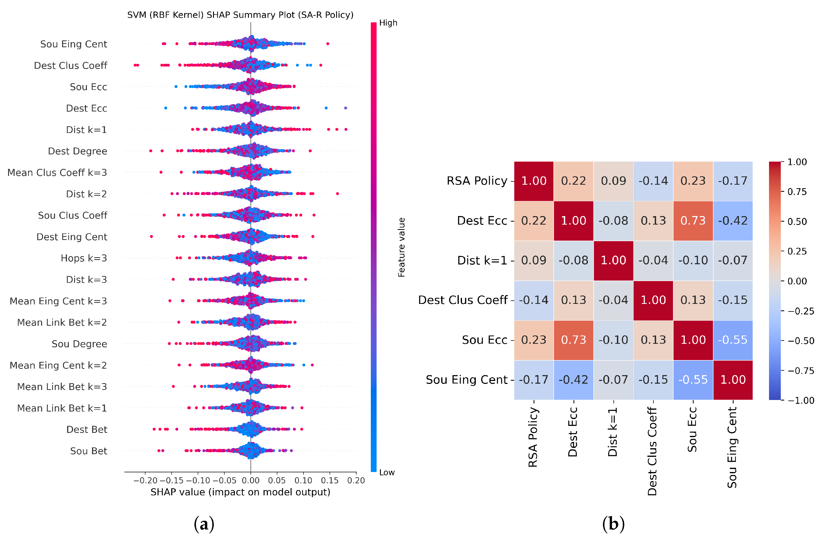 - Exclusion of missing network metric values when there are no possible alternative routes. This occurs, for example, when a given source-destination node pair does not have three available routes, but only two. In such cases, the corresponding row is excluded from the dataset, which resulted in rows, 1704 with the R-SA label, and 8504 with the SA-R label. If this is not carried out, the metrics associated with route k = 3 will be assigned as not a number (NaN);