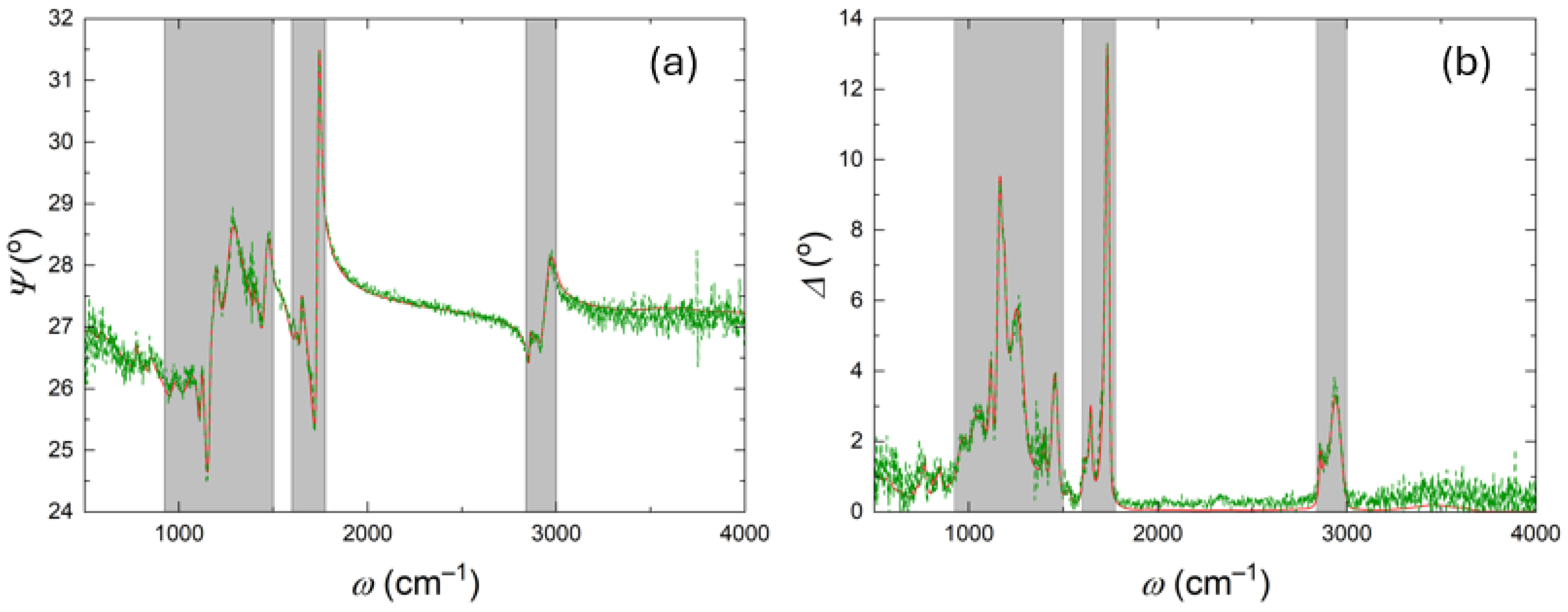 - Herzinger, C.M.; Snyder, P.G.; Johs, B.; Woollam, J.A. Ellipsometric determination of optical constants for silicon and thermally grown silicon dioxide via a multi-sample, multi-wavelength, multi-angle investigation. J. Appl. Phys. 1995, 77, 1715–1724. [Google Scholar] [CrossRef]