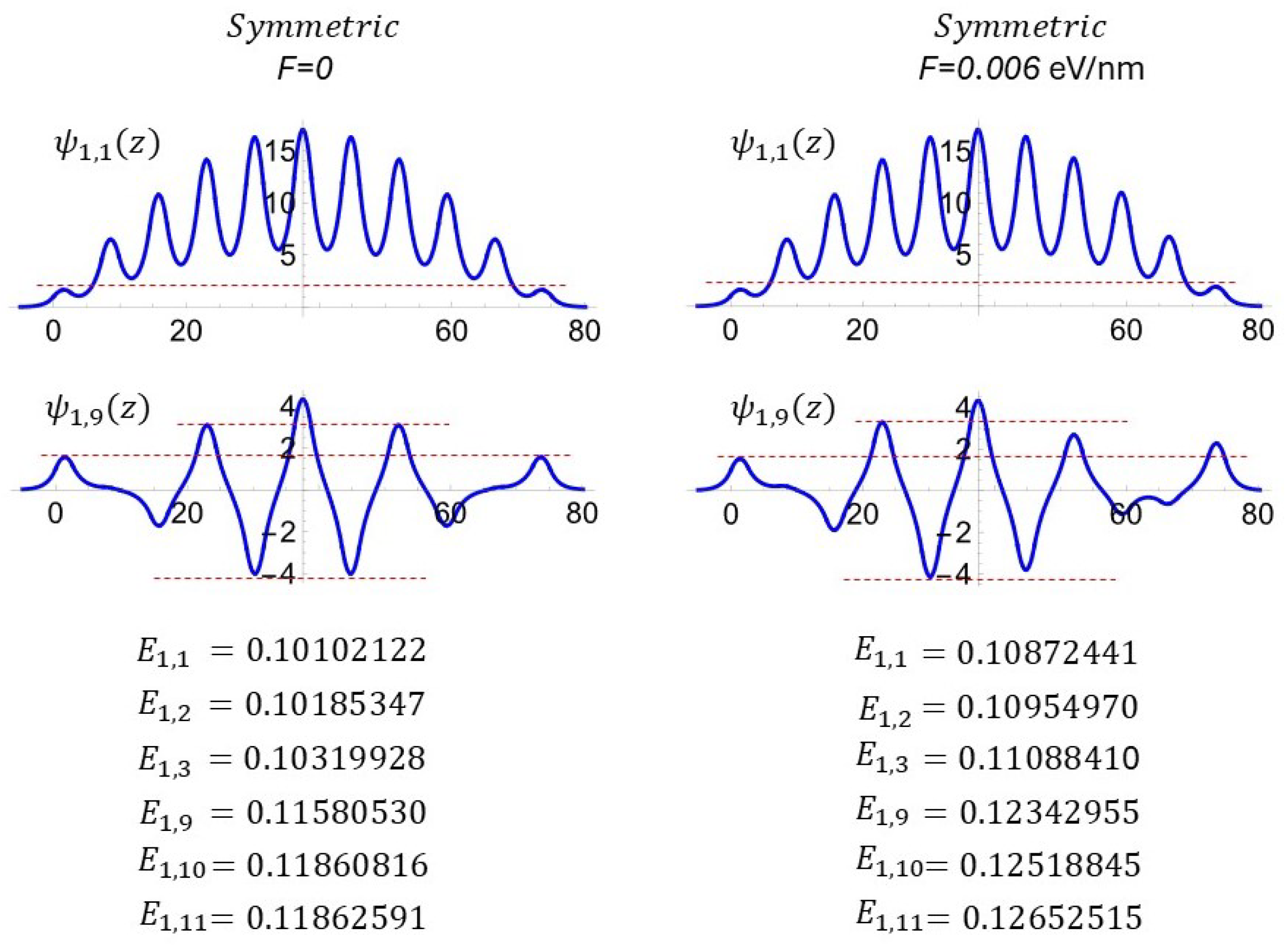 3.1. Effect of Symmetry and Polarization on Energy Eigenvalues and Eigenfunctions