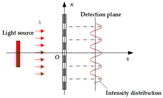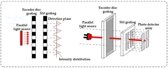 Traditional optical encoders typically operate based on the principle of Moiré fringe effect. The underlying physical process involves a collimated beam that passes through a first grating and undergoes diffraction [2]. The resulting diffracted light is then modulated by a second grating, thereby generating the Moiré fringes used for measurement. The performance of this encoder type is highly sensitive to the alignment tolerance of the gap between the two gratings. Even minor relative displacements can alter the interference field distribution, degrade output signal contrast, and introduce waveform distortion, ultimately increasing measurement errors [3]. In contrast, optical encoders based on the Talbot effect have attracted significant attention due to their greater tolerance to installation misalignments [4,5]. The operating principle is as follows: when a collimated beam illuminates a periodic grating, diffraction produces a periodic self-imaging of the grating at specific distances. High-precision displacement or angle measurement is realized by detecting variations in the light intensity distribution of the self-imaging.